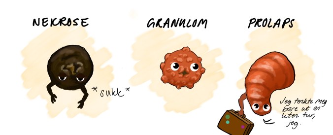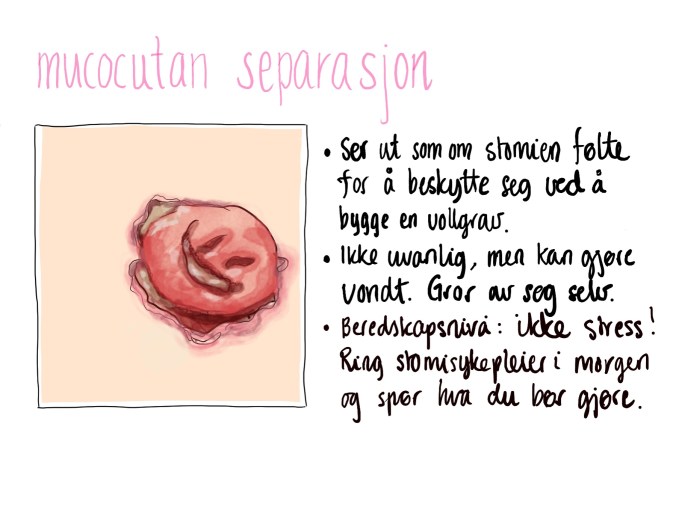 Men nå har jeg fått en ny funksjon på kroppen, og den kom uten bruksanvisning. Og hva gjør man da? Man googler, for stomisykepleier er ikke tilgjengelig sent på kvelden når bekymringene setter seg i brystet. Svarene som internett gir er i all hovedsak tilpasset helsepersonell, og det samme er bildene som følger med. Tro meg, bildesøk på stomikomplikasjoner krever sterke mager. Og selv om jeg har bladd i mammas bøker fra medisinstudiet og gransket bilder med skrekkblandet fryd, er det ikke nødvendigvis slike bilder som beroliger meg når jeg bekymrer meg for at hele magen kommer til å bli et eneste stort sår.