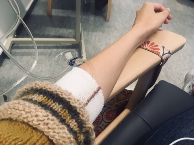 Som kronisk nålepute, både for egne synåler på avveie og sykehusets mer planlagte stikk, har jeg opparbeidet meg nok pondus til at jeg nå kommer med ønsker om hvor det skal stikkes. Håndbaken? Ikke prøv deg! Resultatet blir at jeg gråter av smerte, at blodåren ruller eller sprekker og at det uansett må stikkes et annet sted. Et lite stykke over håndleddet går fint; de ruller ikke så mye der og det gjør ikke på langt nær like vondt. Albuekroken er det sikreste, men da må jo armen være ganske rett mens jeg får infusjon.